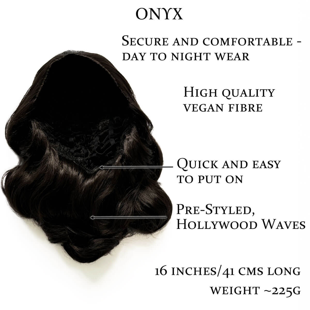 Wenn du auf der Suche nach dem perfekten Vintage-Look im Bettie-Page-Stil bist, ist diese Halbperücke genau das Richtige für dich. Die von unserer Lieblingsbraut Morgana entworfene Onyx ist extra voll und federnd mit der perfekten Vintage-Locke. Sie ist ideal für Haaranfänger und -profis, die sich einen umwerfenden Pin-up-Look wünschen, aber nicht genug Zeit, Haare oder Geld für Friseurbesuche haben!