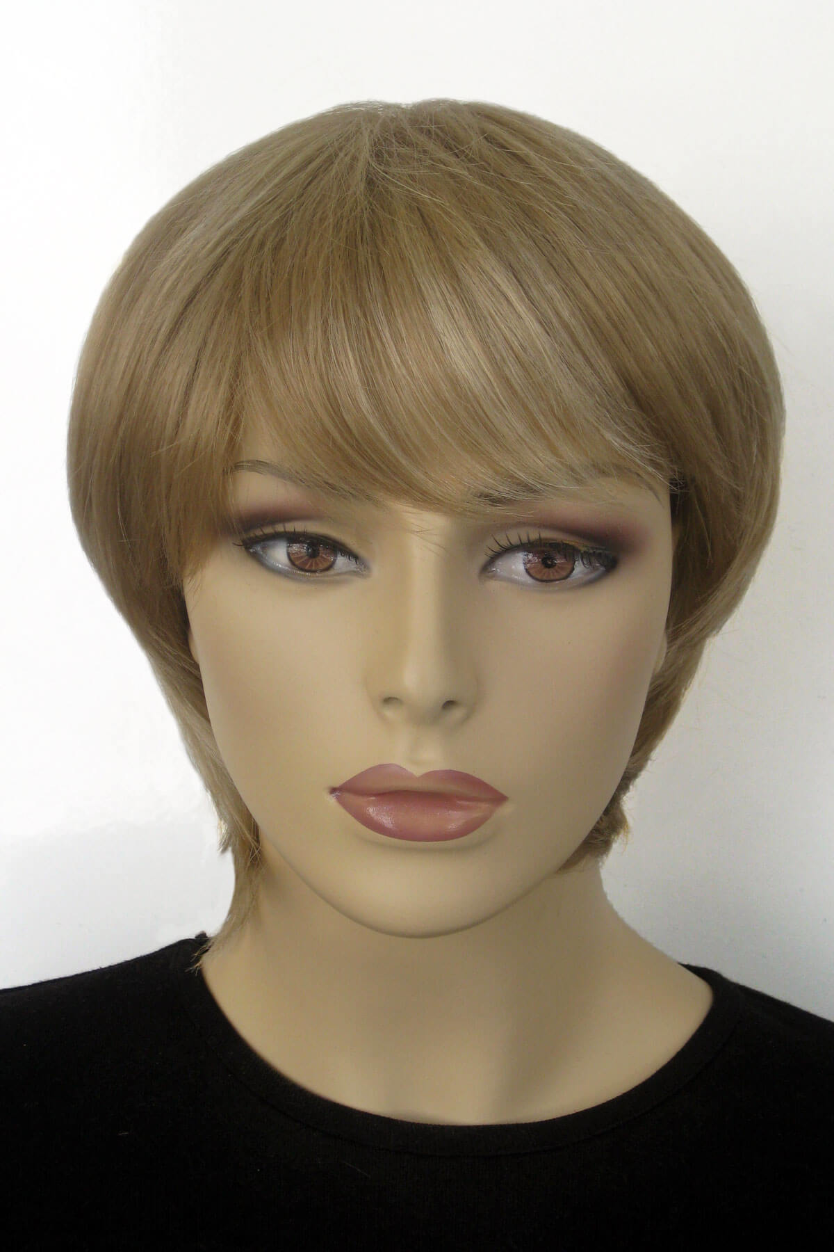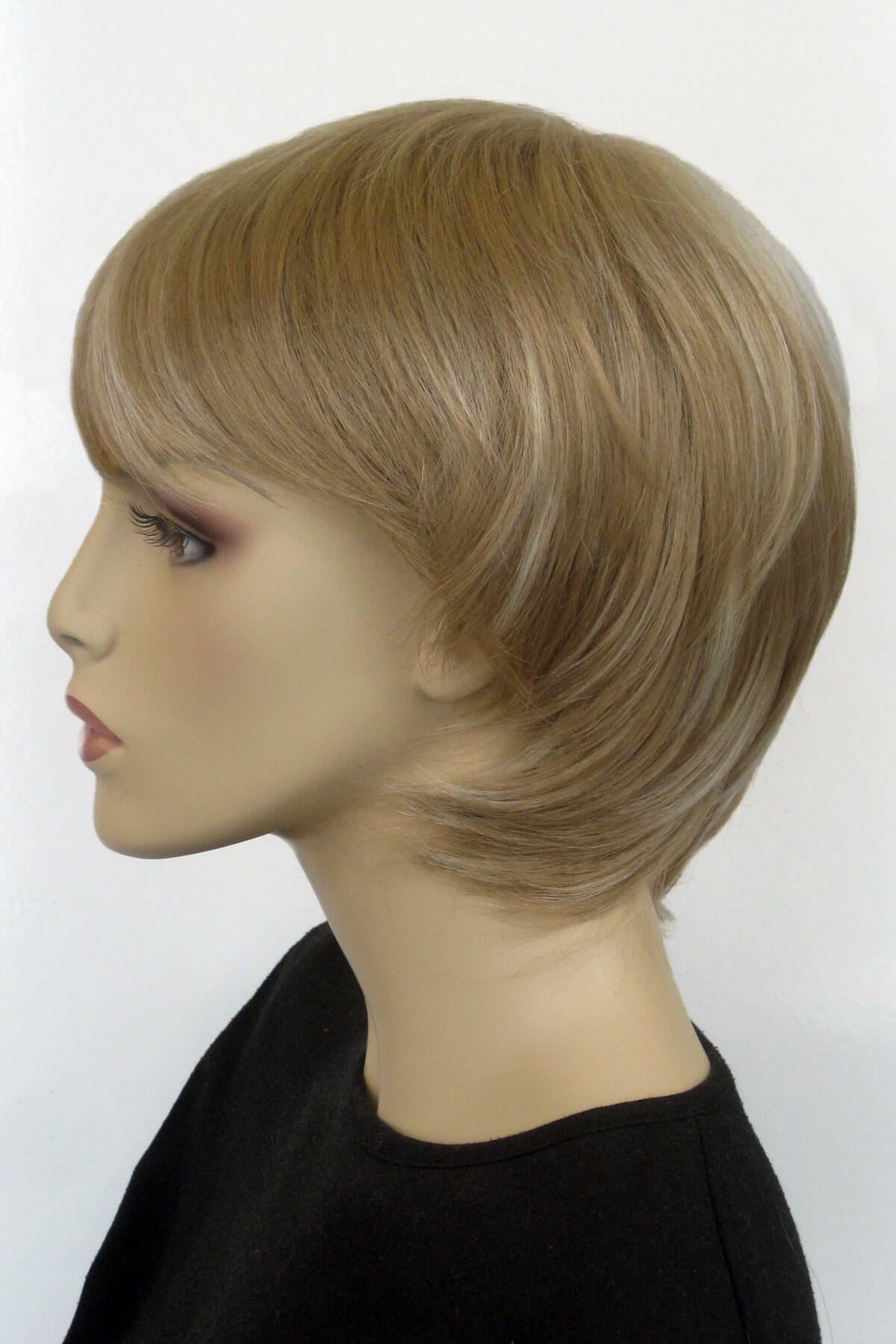 Diese elegante, zweifarbige blonde Perücke hat durchgehende Stufen und einen dezenten Pony. Der perfekte „Pixie“-Stil für den ganzen Tag und jeden Tag. Das Blond ist eine Mischung aus Aschblond mit hellblonden Highlights.