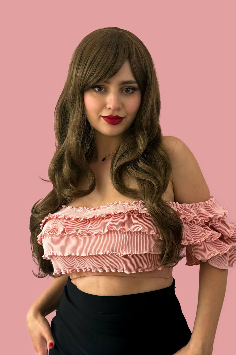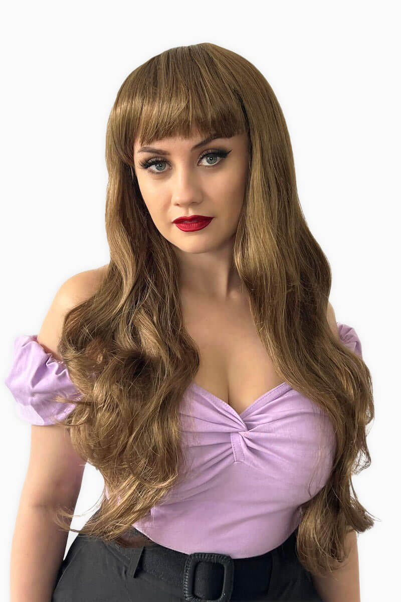Lange gewellte hellbraune Perücke mit geradem Pony im Vintage-Stil: Maya