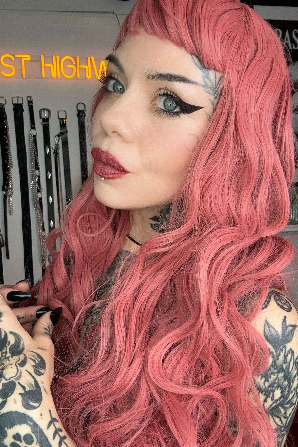 Lange pastellrosa Perücke im Pinup-Stil mit sanften Wellen und kurzem Pony: Candy